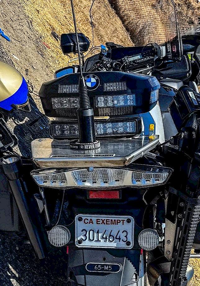 Initially, during the use of the Kawasaki motorcycles, the GE radios were supplied in a white GE fiberglass radio housing, with a flat top. When the "extenders" were added in 1996, GE supplied a spacer to raise the top of the housing. Some of these spacers were lettered "California Highway Patrol" while others were not. At the time that the BMW cycles began to be placed into service, the GE housings were surplused, as the factory BMW streamlined radio box is sufficient to fit all the equipment inside. The BMW installations continue to use the GE M-PA modified hand-held radio "extender" although the "extender" operations are switching to 700 MHz with the transition to the EF Johnson hand-held radio (see my "CHP 2009" radio page) and the GE "extender" units will have to be removed.