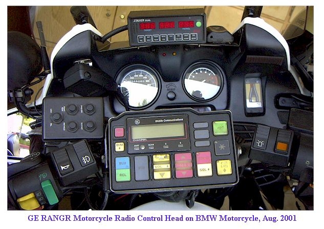 The CHP motorcycles also use the RANGR radio, but with a motorcycle version S815 control head as shown on the BMW motorcycle below. Originally, the Kawasaki 1000 motorcycles were fitted with a white fiberglass radio weather housing supplied by GE and marked "California Highway Patrol" on both sides. When the "Extender" repeaters were added to motorcycles, an extra spacer section was added to the white "GE" radio box lid to allow for the extra height of the extender equipment. Then, when the Kawasakis were replaced by BMW motorcycles, BMW supplied a streamlined radio weather housing with the cycle, big enough for everything, and the GE boxes were surplused out. These BMW motorcycles will be phased out after 2011 with Kawasaki Councourse police motorcycles as they are run out. See my CHP Motorcycle pages for more data.