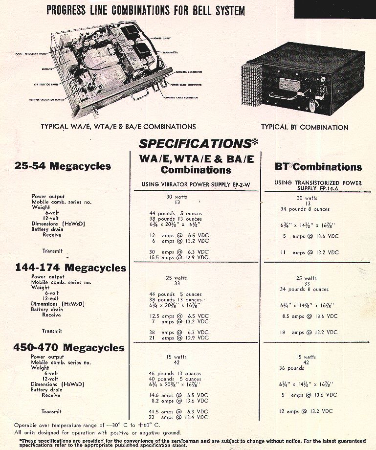 Throughout the early 1950's, a typical MTS installation would consist of a nearly generic Motorola Deluxe, Research Line (later "Twin-V") or GE "Progress Line" two way radio with a Western Electric 41A or 47A series control head. The Motorola equipment always used the Western Electric 102A external selector, whereas the GE Progress Line equipment used its own internal selector, labeled the VS-1. Older GE equipment pre-dating the "Progress Line" also used the Western Electric external selector. Typical Motorola radio numbers were W43-1 and W41-1, the "W" standing for Western Electric contract, and the 43 referring to "Urban" while the "41" represented "Highway." Later Motorola numbers were typically W43GGV-1 and W41GGV-1. The GE post-1954 "Progress Line" equipment was numbered WA/E-33 or WA/E-13. The GE Progress equipment initially came in 17" cases to accommodate the internal selector set and a multiple channel deck. The transistorized power supply 12 volt GE "Progress Line" mobiles of the late 1950's had enough room inside to allow use of a narrower, and otherwise standard 13" case.