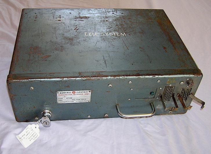 The example below is a vibrator powered 1956 vintage high band GE Progress Line 17 inch "wide case" mobile (BA/E-33) which contains an internal selector called the . Trust me when I say this is one heavy item! This normally would have fed a Type 47A control head with VJB-1 junction box, and was capable of being wired for either 6 or 12 Volt cars. The "Bell System" stencil on the case indicates that this was company-owned lease equipment. Because of the wide case, there was room to internally mount a decider, which was GE's VS-1 panel (possibly manufactured for them by Secode) as identified in the photo below. These Progress Line models were offered in UHF as well, as in some of the larger cities, by 1956, UHF frequencies were being allocated to Bell System car telephone systems.